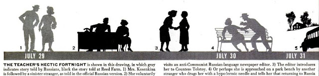 31 июля 1948 на пароходе «Победа», отплывающем из Нью-Йорка, не досчитались двух пассажиров - учителей советской школы, которых отправляли обратно на родину. Как оказалось, учитель математики и директор школы Михаил Самарин попросил политического убежища в США и получил его вместе с семьей. Учительница физики и химии Оксана Касьенкина обнаружилась на ферме бывшей графини Александры Львовны Толстой, куда ее пристроил Марк Вейнбаум, редактор «Нового русского слова». Через некоторое время она (по советской версии) пишет оттуда сумбурное письмо в советское консульство. Консул Яков Ломакин забирает ее в консульство и созывает пресс-конференцию, на которой демонстрирует письмо и обличает «белых» иммигрантов, охмуривших Касьенкину.